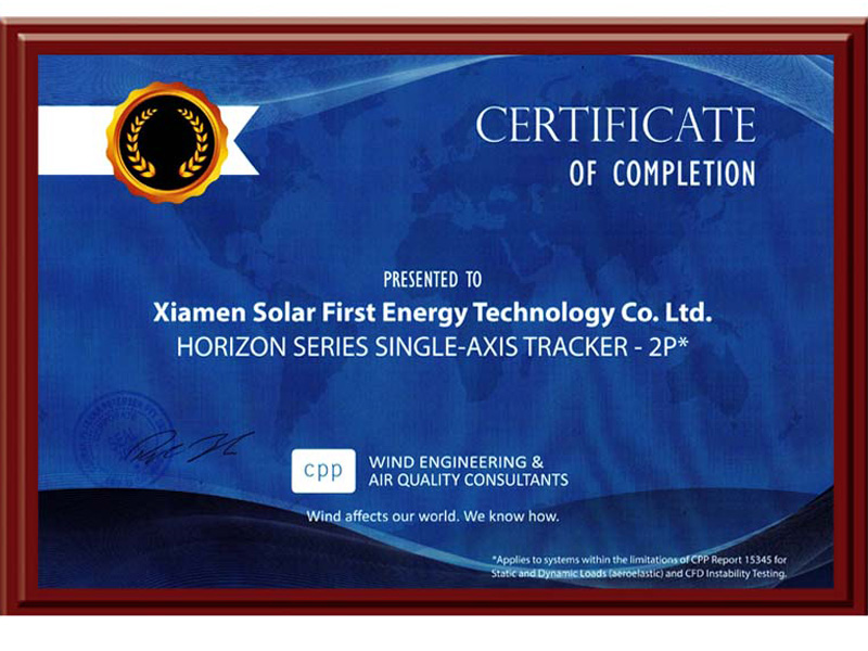 Grupo SolFirsTech cooperó con CPP, una organización acreditada en pruebas de túneles de viento en Estados Unidos. CPP ha realizado rigurosas pruebas técnicas en los productos del Grupo SolFirsTech. Sistema de seguimiento de la serie Horizon D Productos. Los productos del sistema de seguimiento de la serie Horizon D han pasado la prueba del túnel de viento CPP. Informe de certificación CPP Certific...
